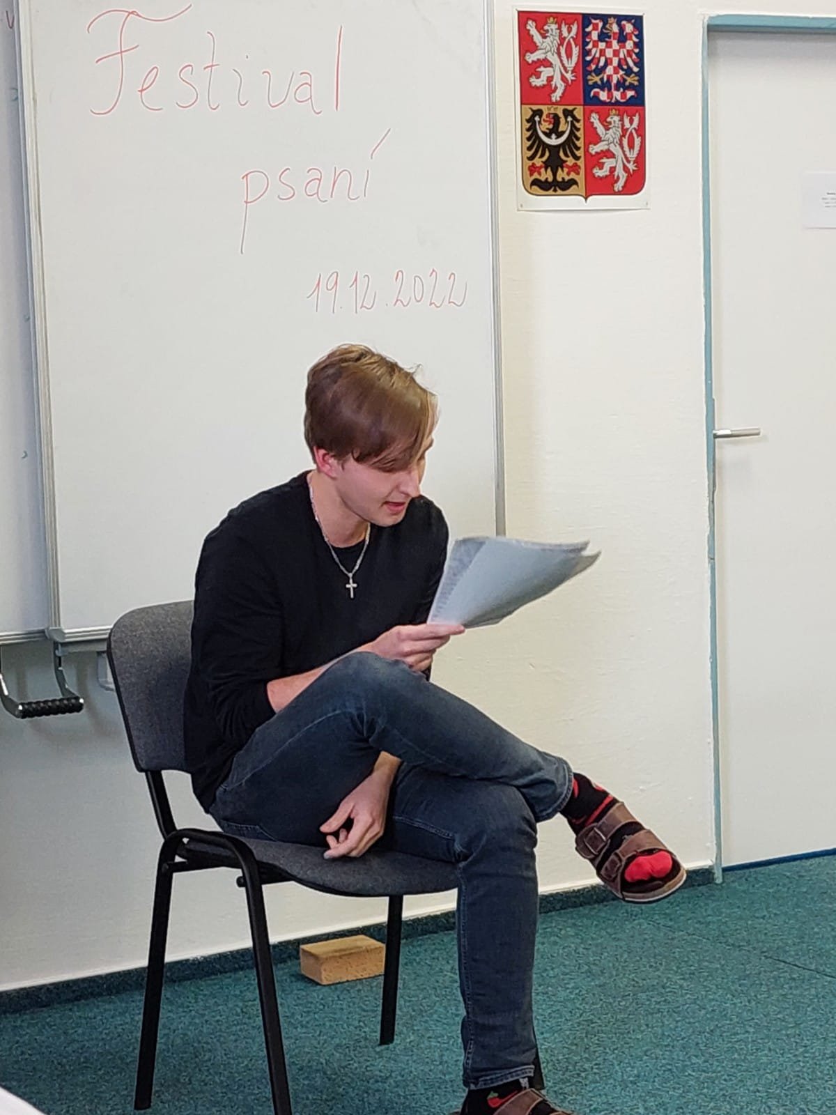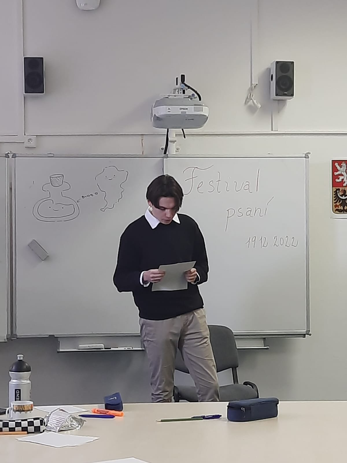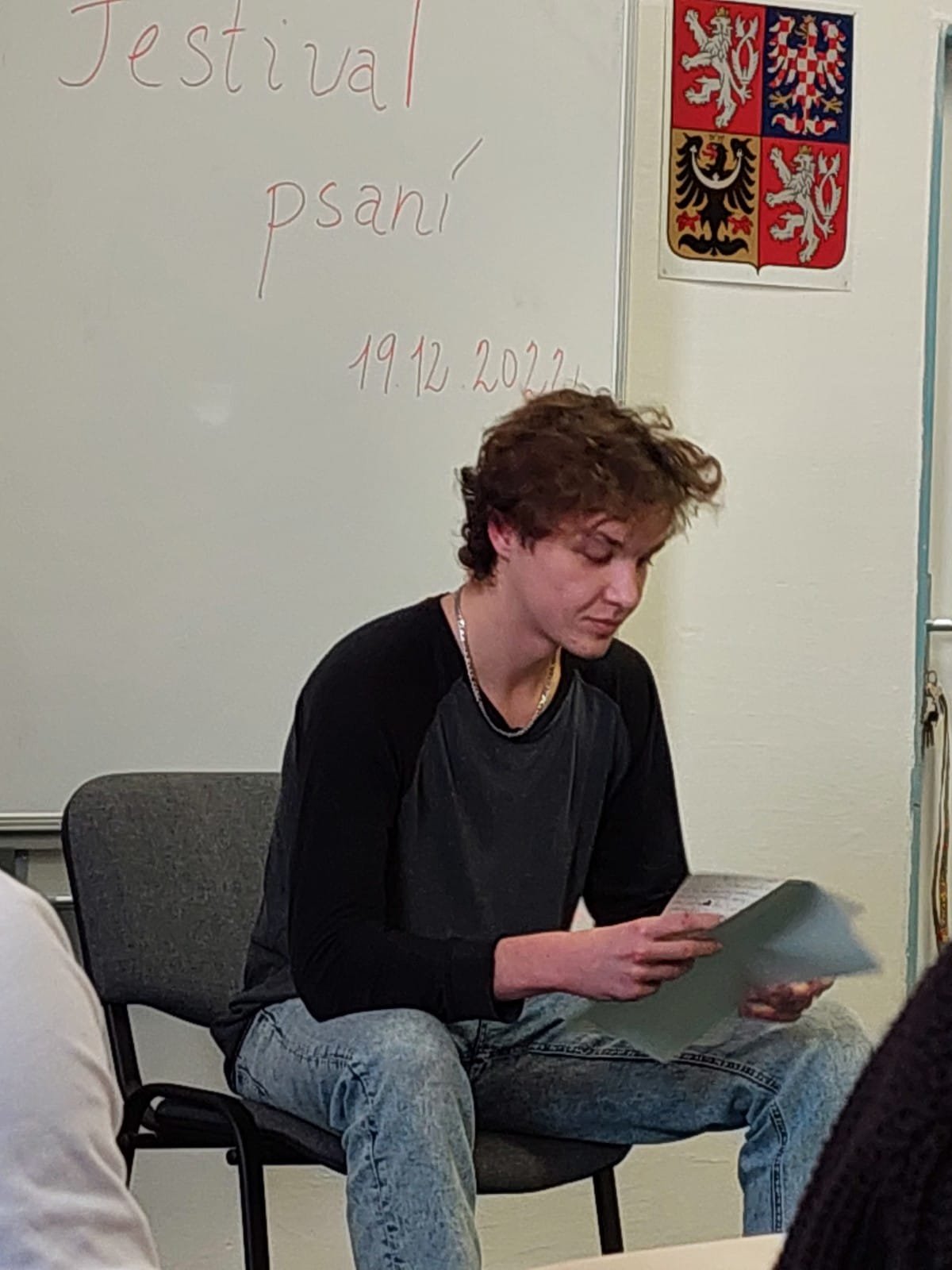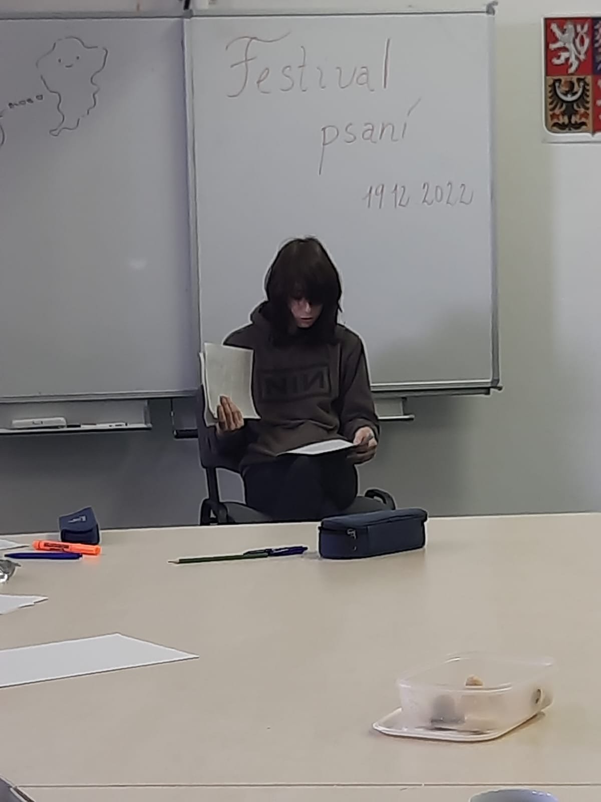 V pondělí 19. prosince proběhl první ročník Festivalu psaní, jehož náplní byla tvorba autorských textů. V tomto předvánočním čase se v klubu sešli všichni příznivci tvůrčího psaní z naší školy a v příjemné atmosféře naplno popustili uzdu své fantazii i básnickému střevu.